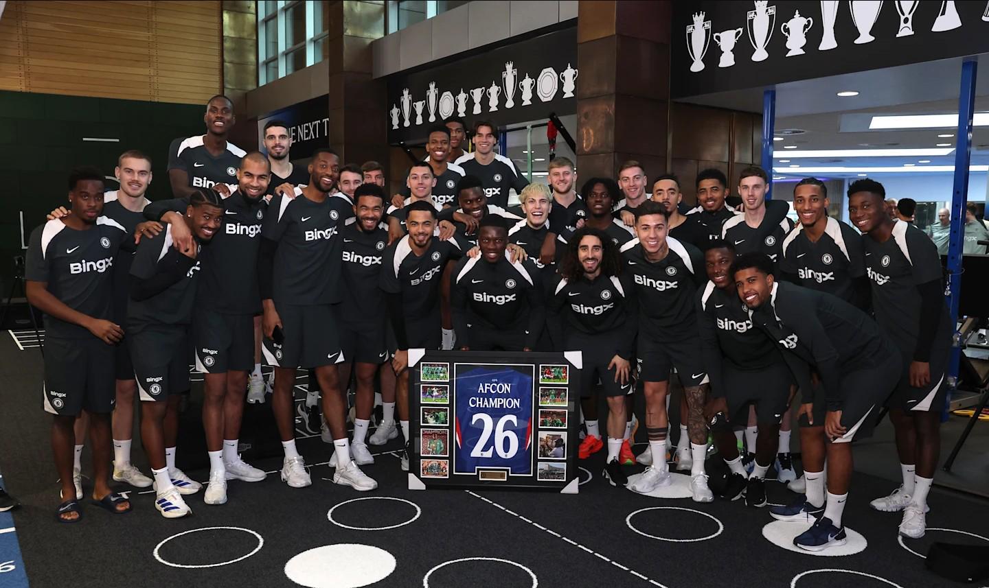 马马杜-萨尔被召回后,切尔西球员共同祝贺他赢得非洲杯冠军